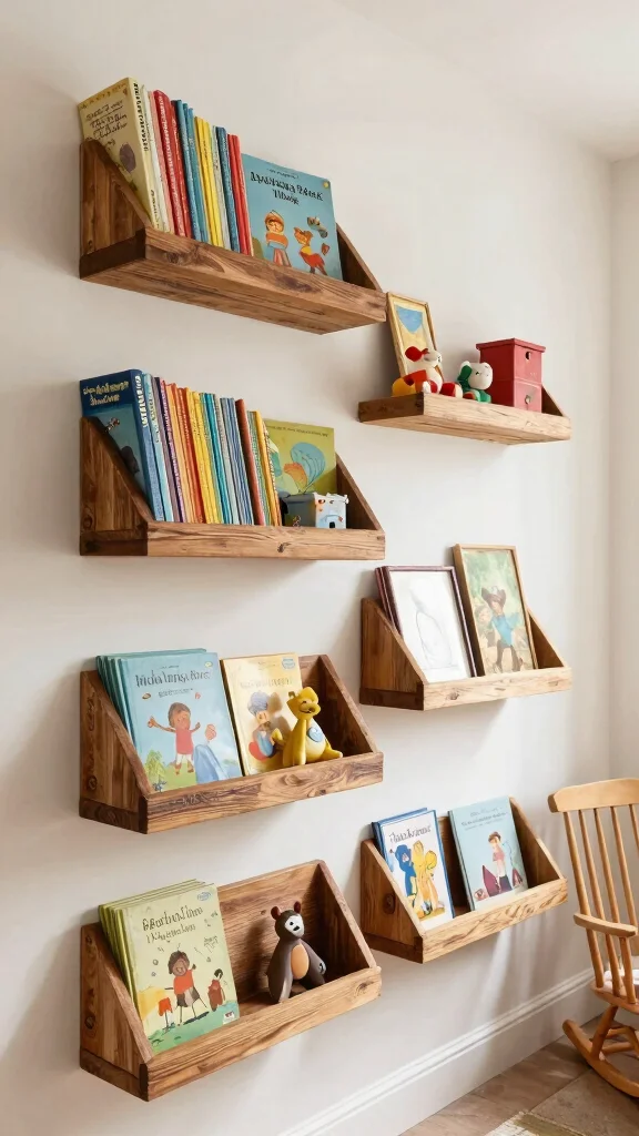 Floating shelves are a chic and practical solution for displaying decor and books in your baby’s nursery. Opt for vintage-style shelves made from reclaimed wood or adorned with decorative brackets to enhance character. Position these shelves at varying heights to create visual intrigue and maximize wall space.
