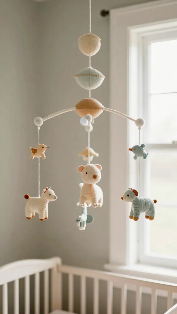 A vintage-inspired baby mobile enhances the cozy design while promoting sensory development in your nursery.