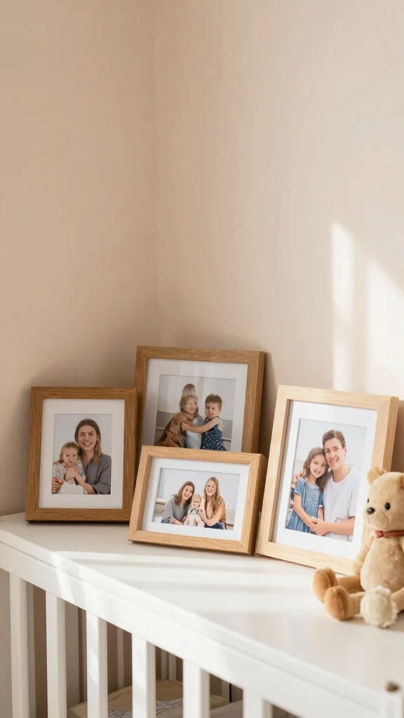 A well-curated family photo display brings a baby boy room decor to life. Start with a cohesive frame theme, mix sizes for a gallery wall, and swap in new memories every season to keep the space warm and personal.