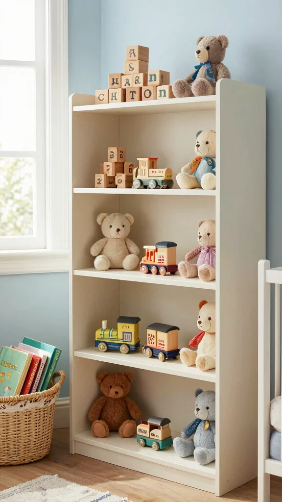 Choose open shelving to showcase toys while keeping the nursery organized. Mixing in books and decorative boxes enhances visual appeal without sacrificing functionality, creating a cohesive look that feels playful yet refined.