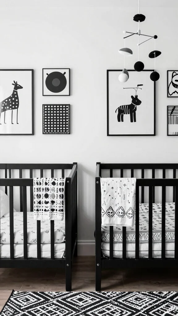 To bring this design to life, focus on sourcing black-and-white patterns for linens and art. Look for budget-friendly options that allow you to easily update the decor as your child grows. This theme aligns with current trends that favor high-contrast designs for their stimulating effect.