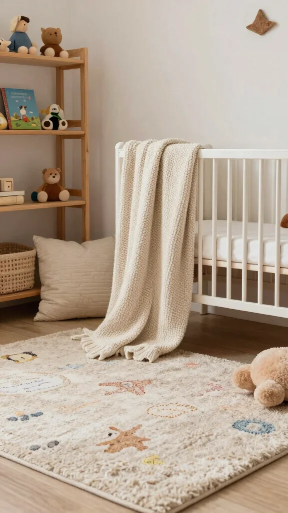 – Include wooden elements, like a rocking chair or shelves, for warmth.