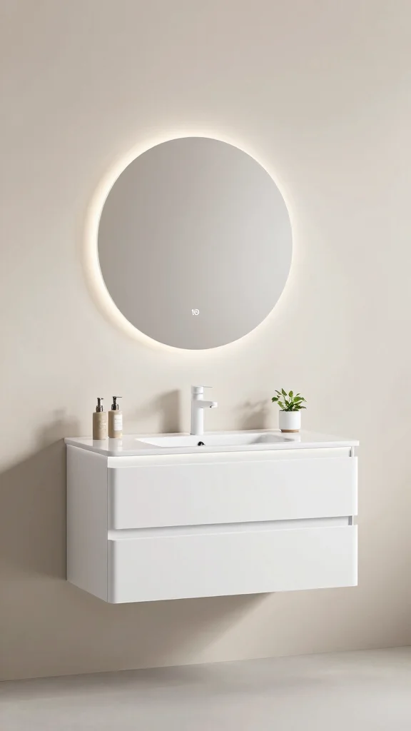A minimalist floating vanity is your go-to for achieving a clean, contemporary look that maximizes space. This design creates an illusion of openness, making your bathroom feel larger and more inviting. Opt for a crisp white finish with sleek lines, and complement it with a round mirror to add softness. The floating nature makes cleaning a breeze, while chic accessories like a stylish soap dispenser elevate the overall look.
