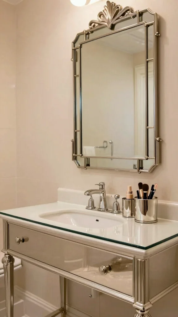 Integrate a statement mirror with a metal frame to tie the design together, enhancing the overall aesthetic. Keep your makeup stored in chic metallic containers that not only provide organization but also contribute to the glamorous feel of your space. Contrasting colors can make metallic finishes pop, creating a stunning visual effect in your bathroom.