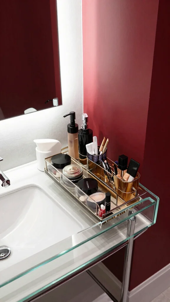 Pair your glass vanity with chic fixtures and bold wall colors to create a high-end feel. Beautiful storage containers can keep makeup items organized and visually appealing, adding to the overall sophistication. Keeping glass surfaces clean and streak-free will ensure your vanity remains a stylish focal point in your bathroom.