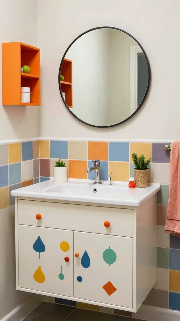 A round mirror and fun decorative accents can further enhance the playful vibe. To maintain organization, use vibrant storage solutions that complement the overall theme. Consider incorporating florals, geometric shapes, or abstract designs to create a captivating focal point that reflects your individuality.