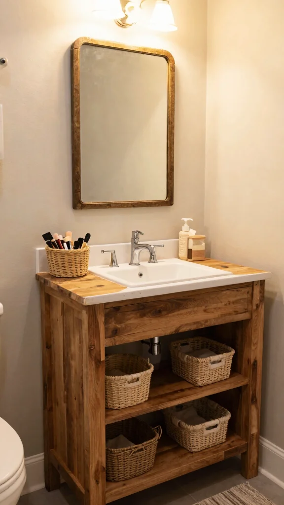 Rustic charm adds warmth without fuss. For a bathroom vanity with makeup area, choose reclaimed wood, open shelving, and a vintage mirror—then finish with soft lighting and organized baskets to keep cosmetics neatly at hand. Cozy, practical, and endlessly inviting.