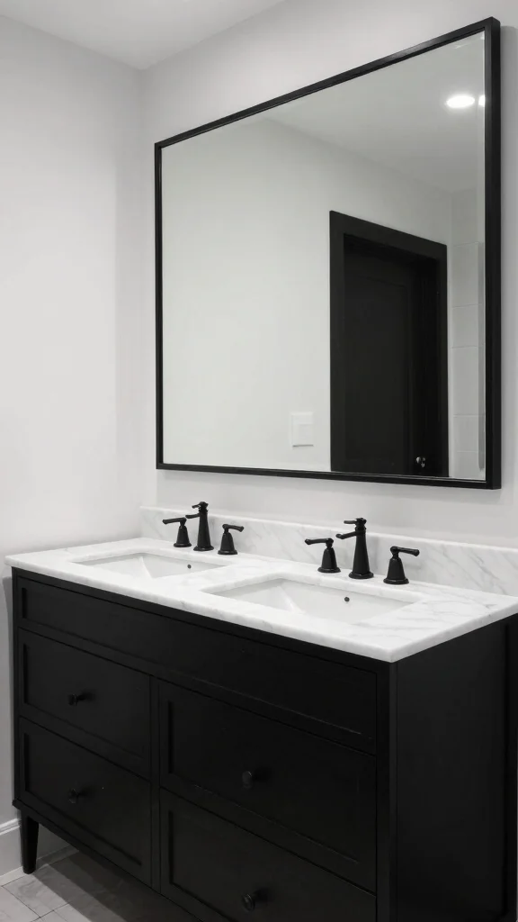 Achieve timeless elegance with a sophisticated black and white bathroom vanity design. This classic color scheme remains stylish and enhances any bathroom aesthetic, providing a refined backdrop for your beauty routine. A sharp black vanity paired with a white marble top creates a stunning contrast that draws the eye and elevates the entire space.