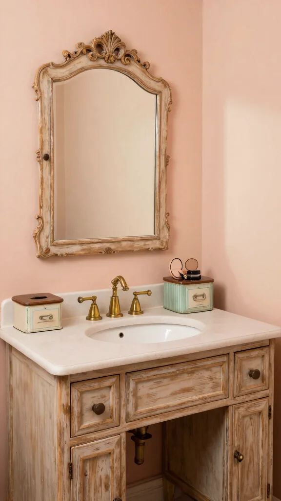Step into a world of nostalgia with a vintage bathroom vanity that beautifully combines style with functionality. A distressed wood finish and intricate details bring warmth and character, making your bathroom feel inviting and unique. This setup not only serves as a practical makeup station but also acts as a charming focal point, perfect for those who appreciate timeless design.