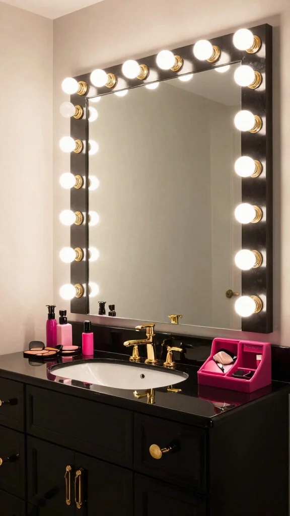 Complement the design with an artistic mirror that draws attention and highlights your style. Keep storage practical with unique containers that match the overall vibe, ensuring your makeup remains organized. Pair artistic elements with more classic designs for a balanced aesthetic that feels curated and intentional.