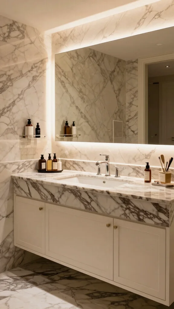 Choose a double-sink setup for added functionality, providing ample space for your beauty products. Highlight your vanity with beautiful under-sink lighting that creates a soft glow, making your morning rituals feel special. Opt for high-quality marble to ensure longevity while adding an element of timeless appeal.