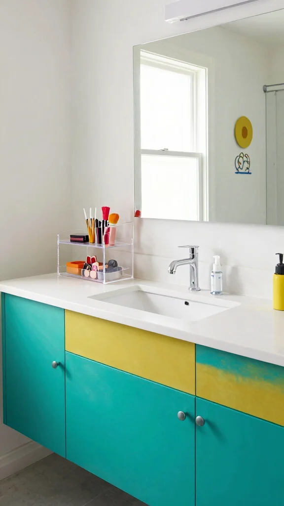 A large mirror can amplify natural light, creating the illusion of a larger space. Organize your makeup using clear acrylic storage to let the colors shine through while keeping everything tidy. Neutral shades for walls can allow your bold vanity to stand out, forming a dynamic visual contrast that enhances your bathroom decor.