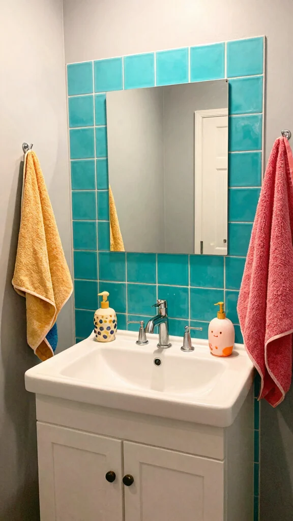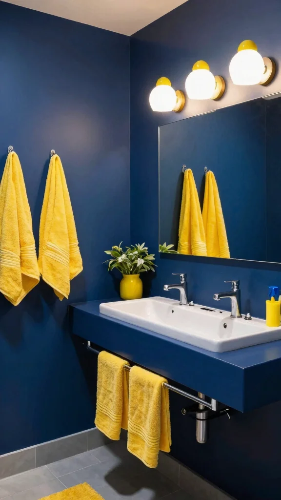 To effectively implement this scheme, use yellow towels and decor items for pops of color that draw attention. Incorporate sleek navy cabinetry to maintain a sophisticated feel while ensuring the space remains fun. Playful light fixtures can further enhance the cheerful vibe, making the room feel inviting.