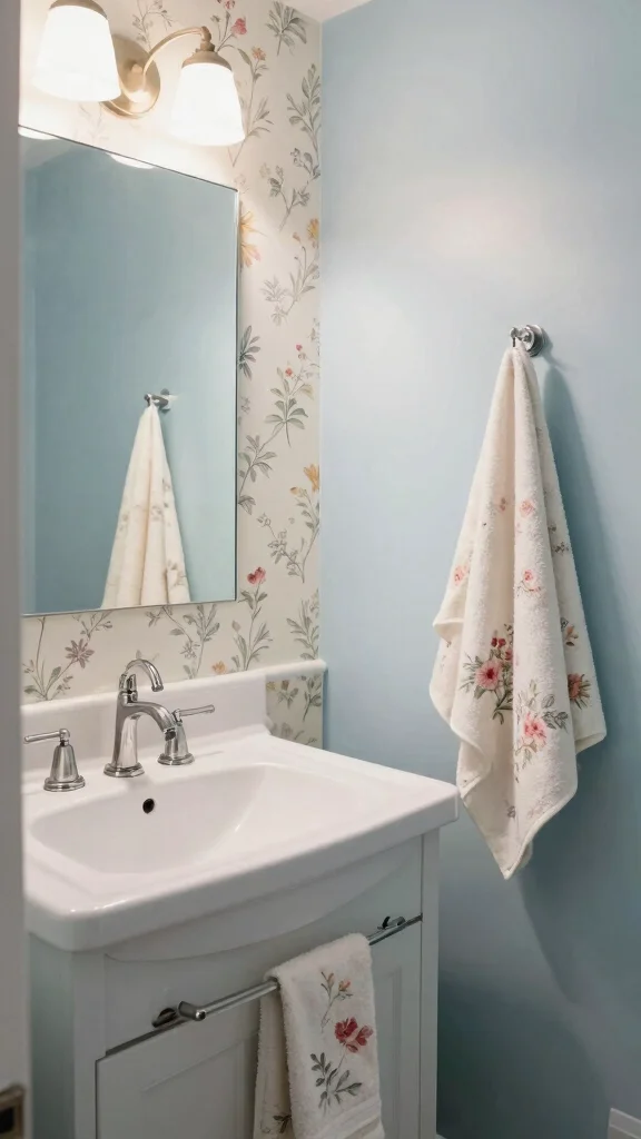 For an effective implementation, consider using floral wallpaper or decals to create a captivating focal point. Incorporate white fixtures to maintain a crisp, clean look that complements the softness of baby blue. Accessorizing with soft textiles featuring floral patterns can further enhance the romantic vibes.