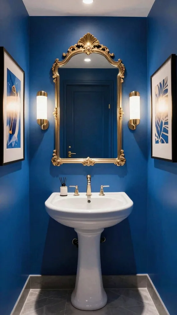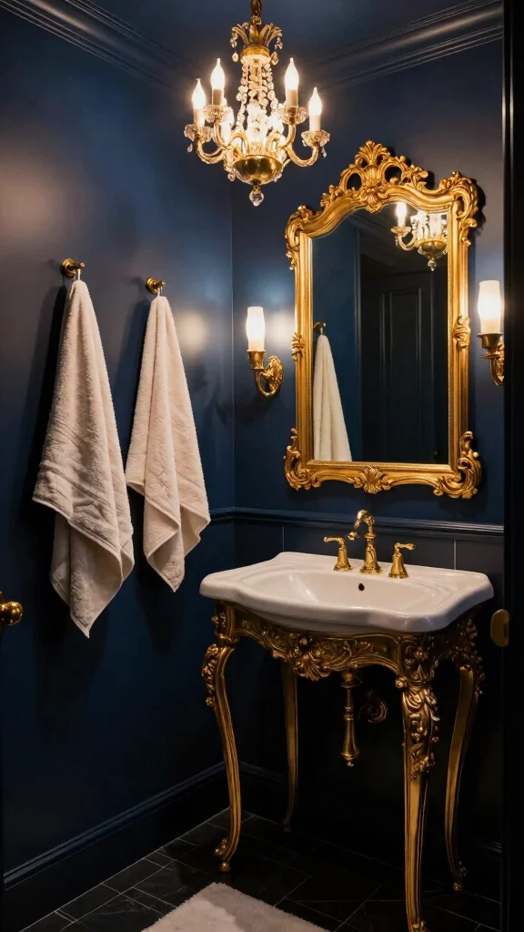 A dark blue powder room paired with antique gold fixtures creates a luxurious and elegant atmosphere. This combination is ideal for those wanting to infuse a sense of grandeur and sophistication in their space. The richness of dark blue, coupled with the warmth of gold, results in a striking visual impact.