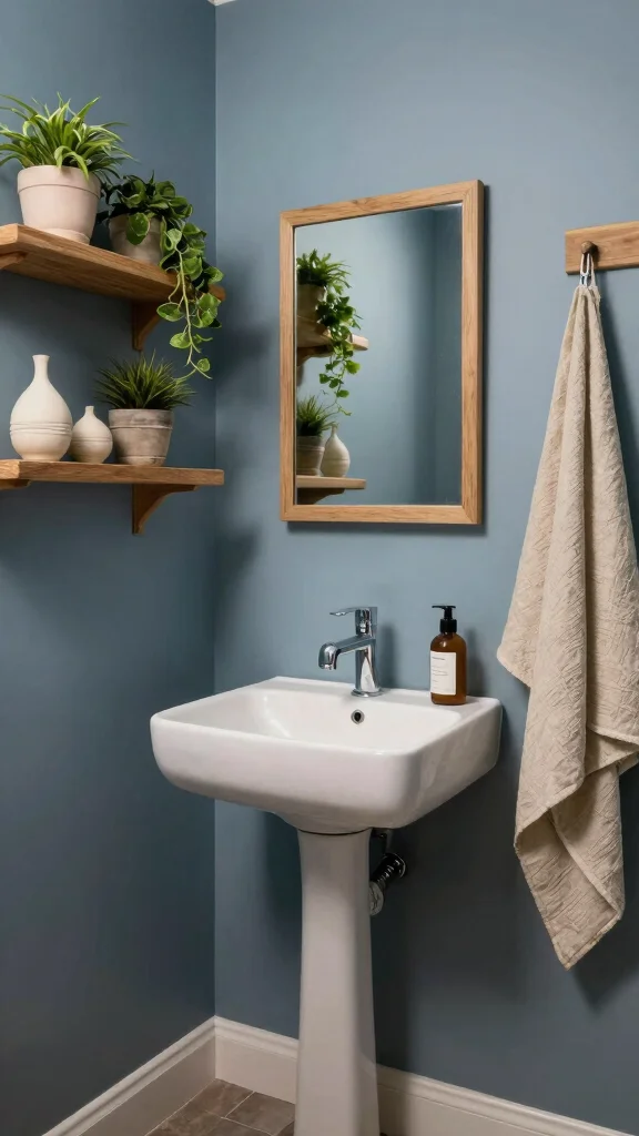 Muted blue beautifully blends with earthy tones, creating a grounded and organic feel in your powder room. This design is perfect for those who appreciate nature-inspired decor, allowing the space to feel warm and inviting.