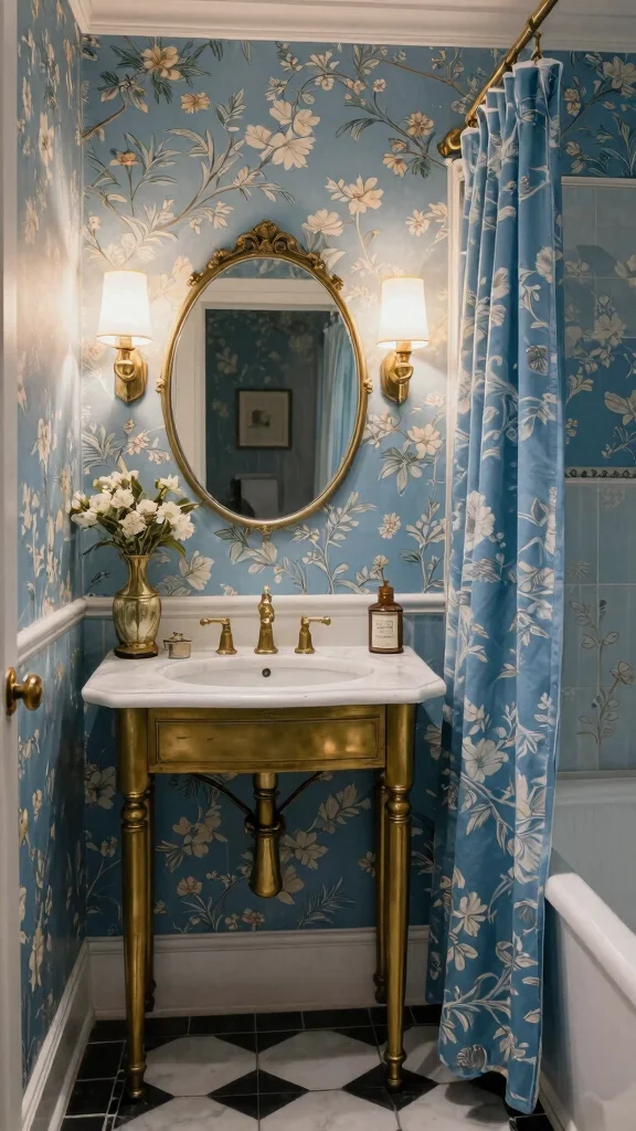 If you have a penchant for vintage charm, decorating your powder room with blue accents can be simply delightful. Imagine floral wallpaper featuring a rich blue base complemented by antique brass fixtures, creating a nostalgic yet classy ambiance. This design invites warmth and character while remaining stylishly timeless.