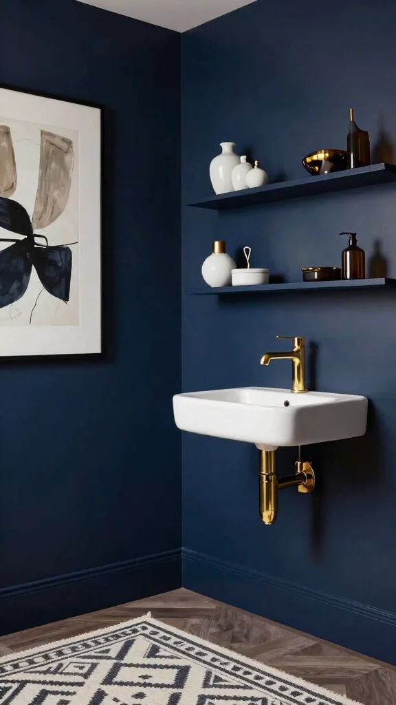 Bold navy is a game-changer for blue powder room ideas—it’s dramatic yet polished. Pair it with gold or brass fixtures and a high-gloss finish to reflect light and deepen depth. Add floating shelves in lighter hues to keep the look fresh and balanced.