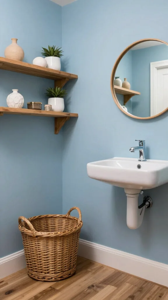 Fun fact: soft powder blue walls can visually enlarge a small powder room by 10-15%. Pair them with white fixtures and natural wood accents to boost light and warmth, turning your space into a calm, welcoming retreat—perfect for blue powder room ideas.