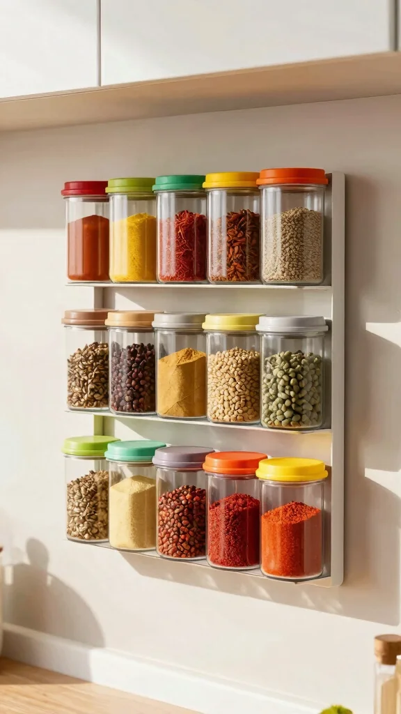 Using magnetic spice racks frees up drawer space while adding a unique touch to your kitchen decor. Clear containers can enhance the chic look of your spice display.
