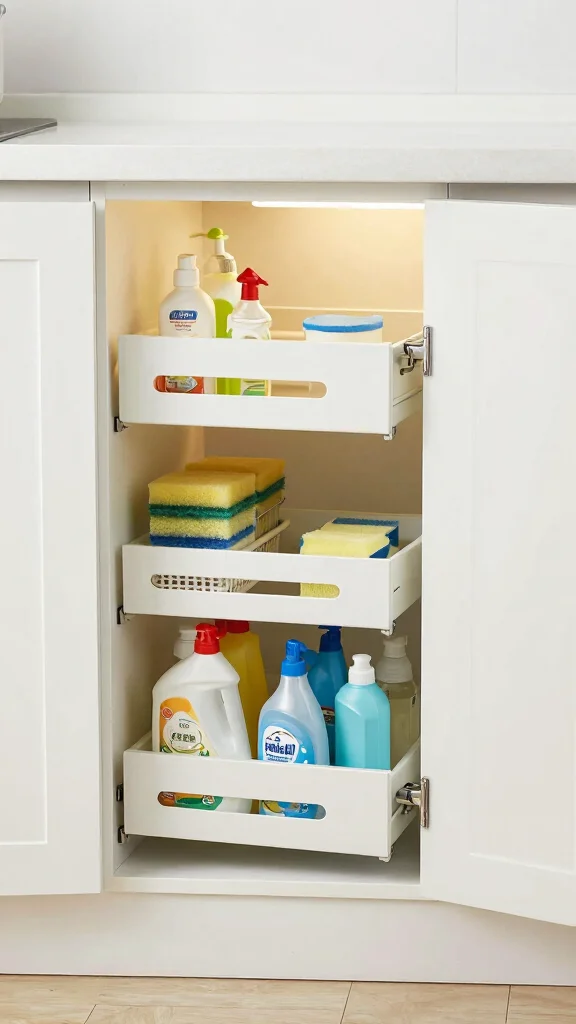 Don’t let the area under your sink go to waste! By adding sliding drawers or tiered shelving, you can transform this often-overlooked space into a home for cleaning supplies and small appliances. Keeping these items out of sight yet accessible not only declutters your kitchen but also enhances its functionality.