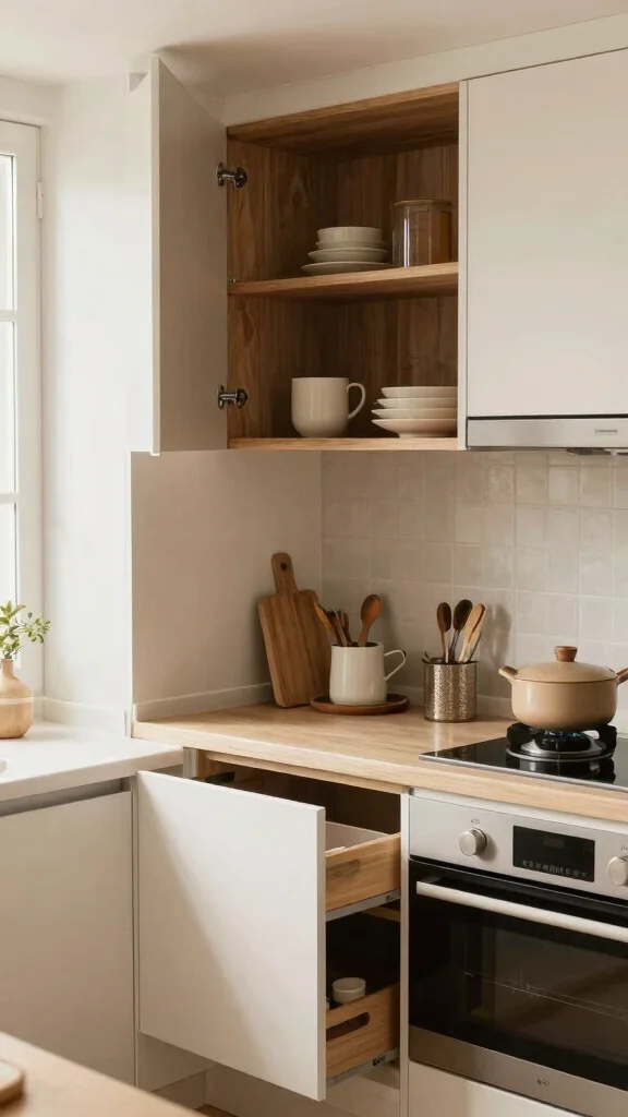 Fun fact: hidden compartments can add up to 25% more usable storage in small kitchens. These clever nooks tuck pots, pans, and baking sheets out of sight without sacrificing style. It’s a smart move in cabinet storage ideas kitchen—the path to organized, clutter-free counters.