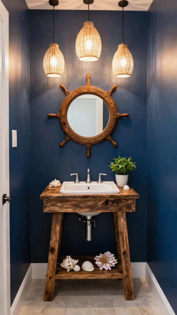 Nautical-Inspired Fixtures: Incorporate elements like ship wheels or lanterns to give your powder room an authentic coastal feel.