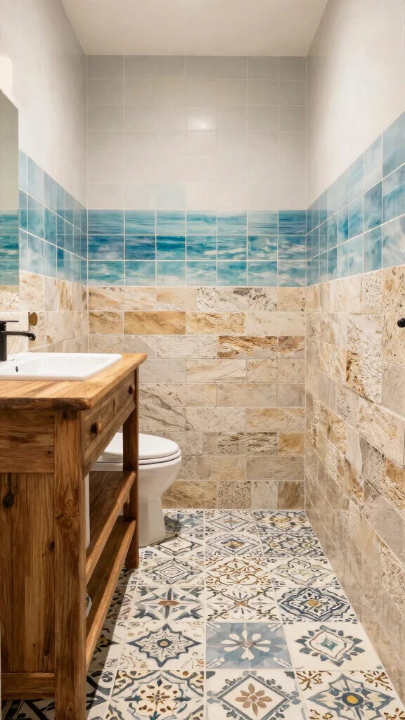 Incorporate beachy tile designs, like mosaic patterns or sea glass tiles, to add texture and interest to your powder room.