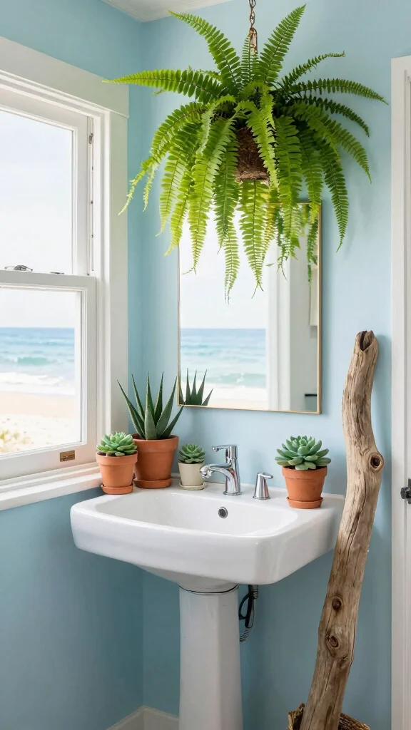 Incorporating greenery into your coastal powder room can instantly breathe life and freshness into the space. Plants not only enhance the aesthetic but can also improve air quality. Opt for low-maintenance plants that thrive in humidity, like succulents or ferns, perfectly aligning with the coastal vibe.