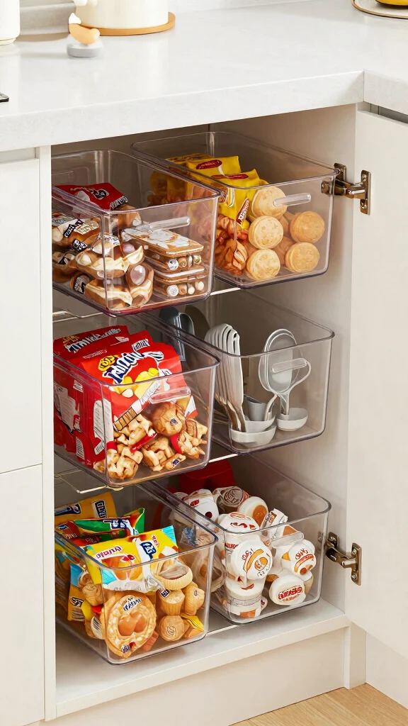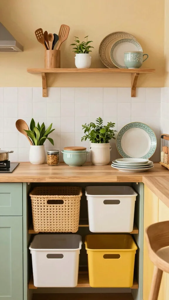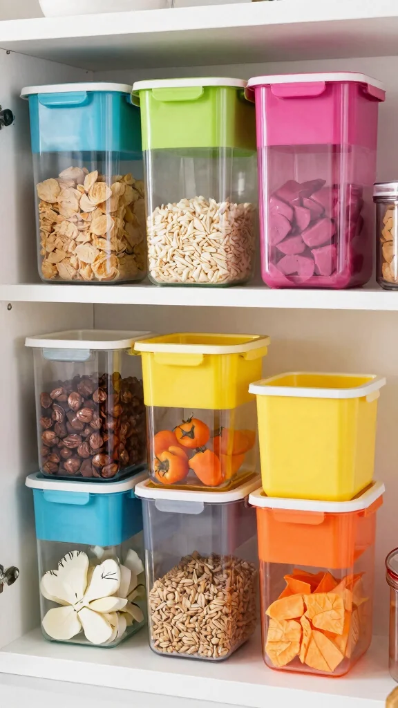 For those who adore organization with a splash of color, color-coded storage containers are a fantastic choice. Use a variety of colors for bins or boxes to categorize items like snacks, baking supplies, and meal prep ingredients, making your kitchen visually appealing and functional.