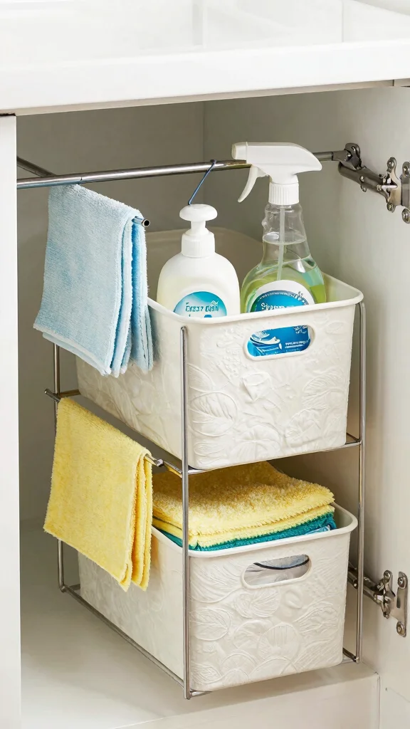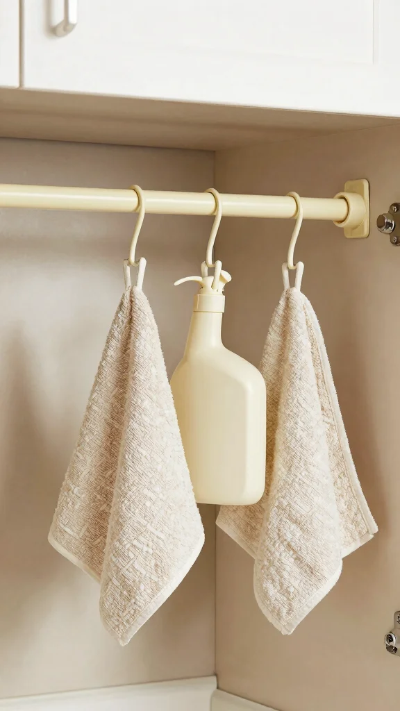 A simple and effective way to enhance storage under the sink is by installing a tension rod. This versatile rod can hold cleaning supplies, spray bottles, or dish towels, keeping everything organized and freeing up space in the cabinet. It’s an easy DIY project that maximizes vertical space while maintaining a tidy appearance.