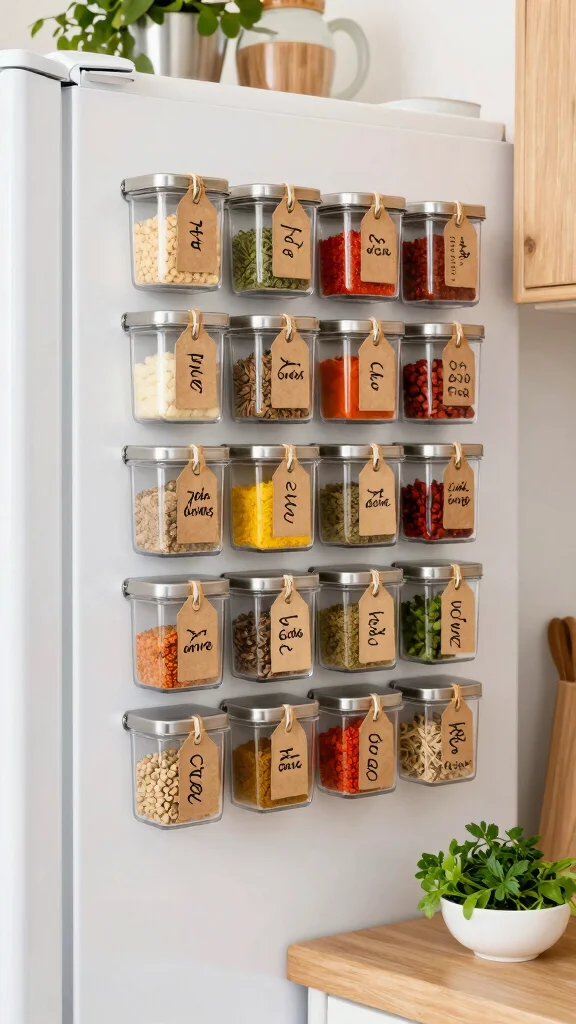 Elevate your spice storage with a magnetic spice rack that combines style and functionality. Using small metal containers with magnetic backs allows you to create a stunning display on your refrigerator or a magnetic board. This innovative solution not only saves shelf space but also keeps your spices visible and within easy reach.