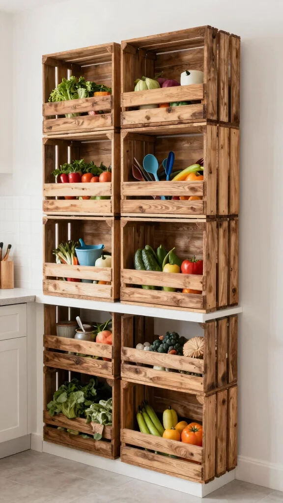 Repurposing wooden crates brings both style and practicality to your kitchen storage, making it a unique focal point.