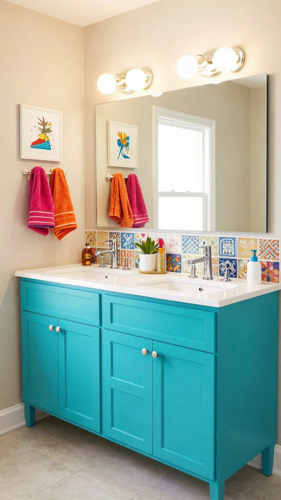 Incorporate colorful accents in your double vanity to introduce personality and vibrancy to the bathroom space.