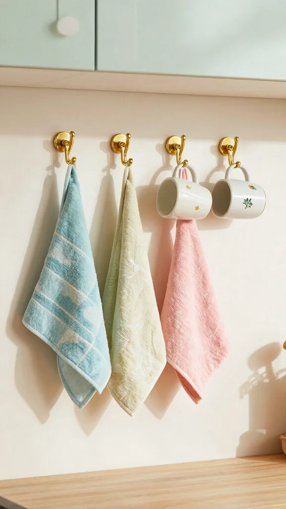 – Use hooks for kitchen towels and aprons for easy access.