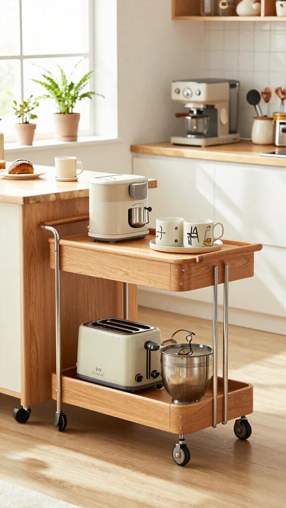 Rolling carts are a versatile addition to any kitchen, especially in smaller spaces. They provide portable storage that can easily move to where you need it most, making them perfect for consolidating appliances and tools. Picture a chic cart holding your coffee station or microwave, offering both functionality and style.