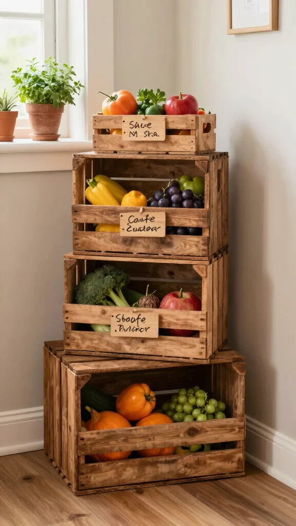 To implement this stylish storage solution, consider painting or stenciling the crates to match your kitchen’s color palette. You can often find affordable crates at local thrift stores or craft fairs. This approach not only enhances your decor but aligns with the latest trends towards sustainable living.