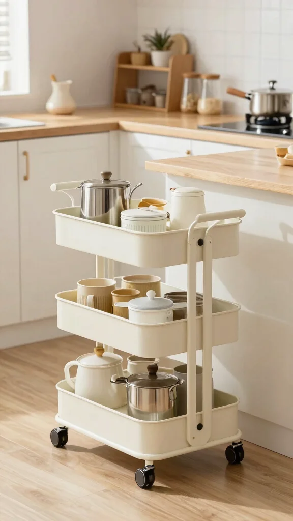 Fun fact: portable rolling carts can slash kitchen clutter by up to 40%, turning any nook into extra storage. With trays and a plant, you can style a cart for eco-friendly kitchen bin storage ideas that boost function and decor.