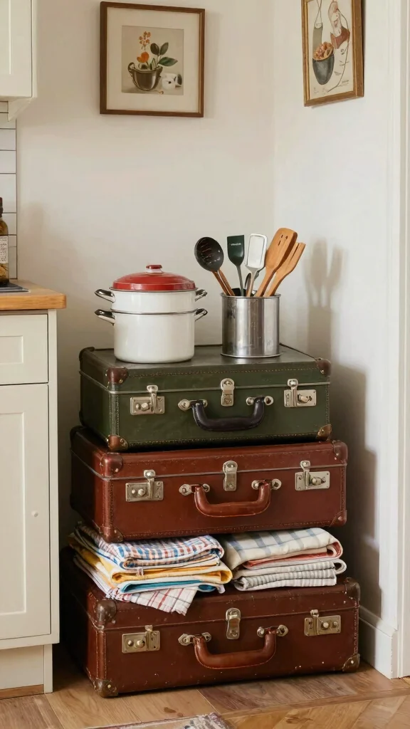 When selecting vintage suitcases, choose ones that complement your kitchen’s style. You can often find these gems at thrift stores or flea markets. Keeping commonly used items in the top suitcase ensures easy access while maintaining a charming aesthetic.