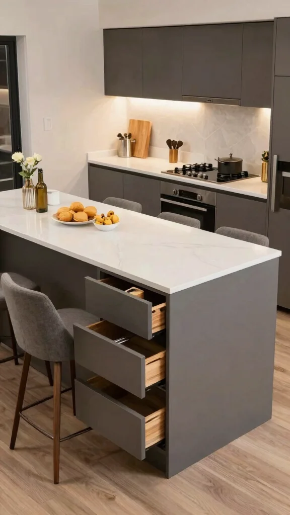 Consider incorporating furniture that doubles as storage, such as an island with built-in bins or an ottoman that opens for storage. This multifunctional approach is perfect for smaller kitchens where every bit of space counts. It keeps your kitchen stylish while maximizing utility without clutter.