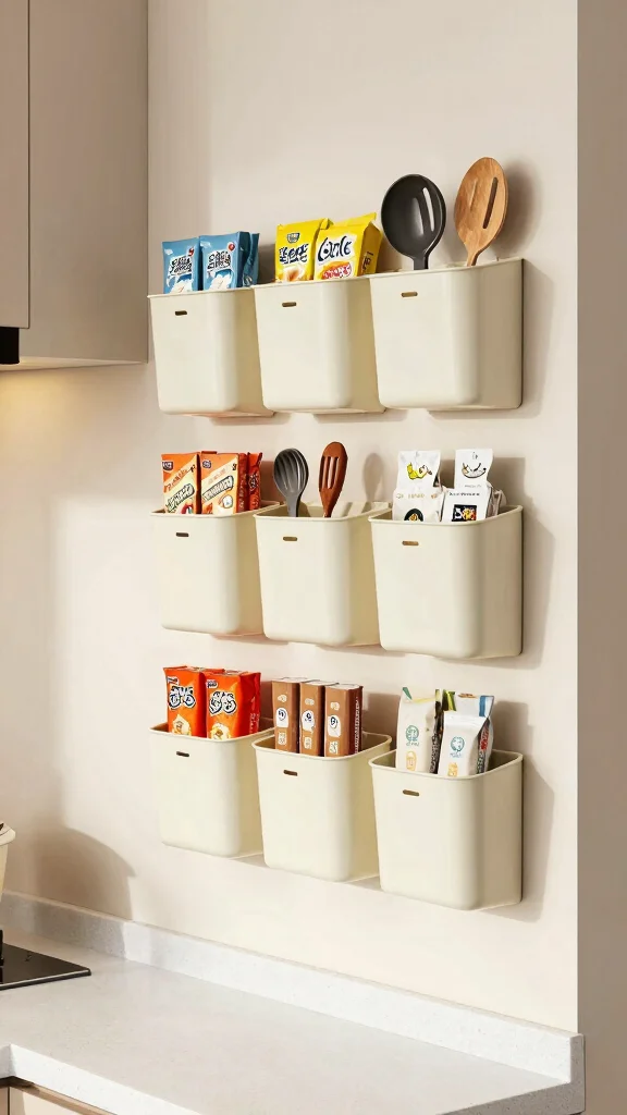 Wall-mounted bins are an excellent solution for adding extra storage without sacrificing precious floor space. Perfect for snacks, utensils, or various kitchen items, they are especially ideal for small kitchens needing efficient organization. This solution declutters countertops while effectively utilizing vertical space.