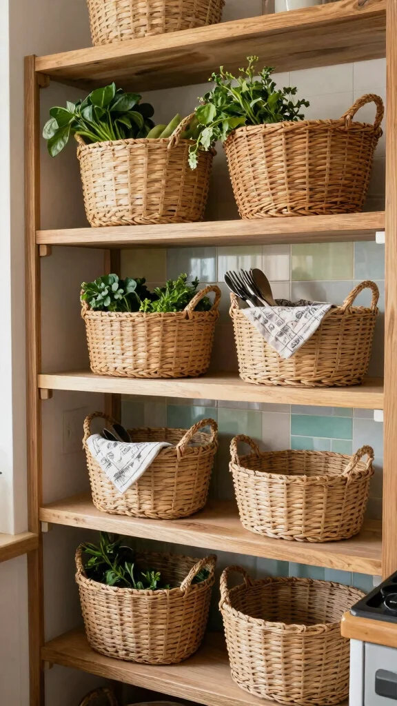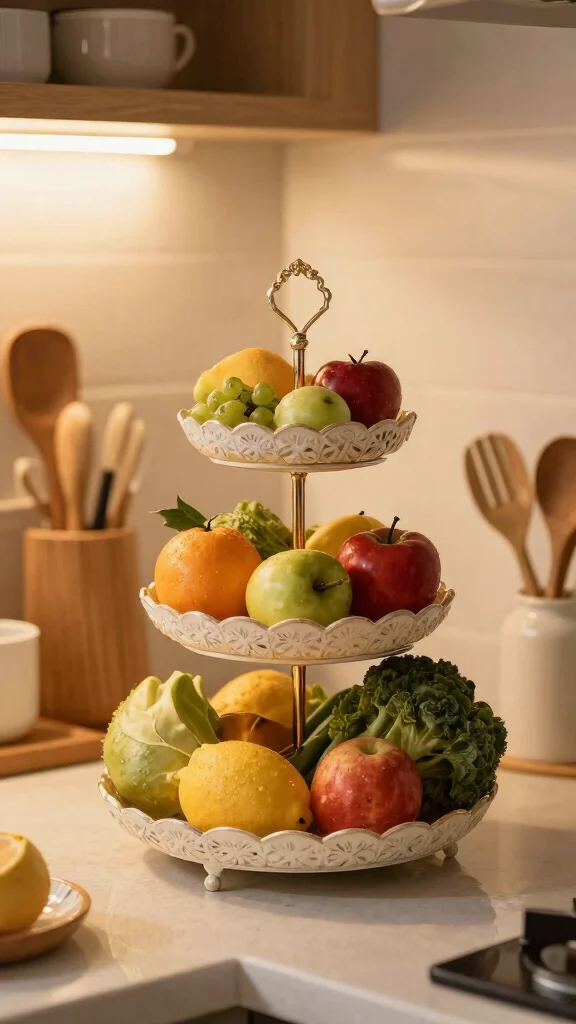 Tiered baskets are an excellent way to add charm and organization to your kitchen. Perfect for displaying fresh fruits, vegetables, or even kitchen linens, this vertical arrangement not only enhances visual interest but also makes it easy to see and access your items. They can easily fit into various kitchen styles, from rustic to contemporary.