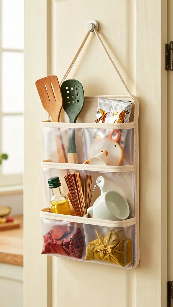 These organizers utilize what would otherwise be wasted space, making them easy to install without any damage to your cabinets. Consider opting for clear pockets for quick visibility or rustic metal racks for added charm. Not only do they keep your essentials organized, but they also bring a playful element to your decor.