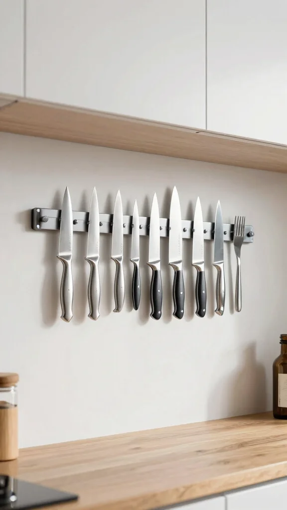 A magnetic strip offers a sleek, modern solution for storing knives and metallic kitchen tools, freeing up valuable drawer space. This innovative storage option declutters your countertops while adding a contemporary touch to your kitchen. You can mount the strip on walls or even the side of cabinets, transforming unused areas into stylish displays.