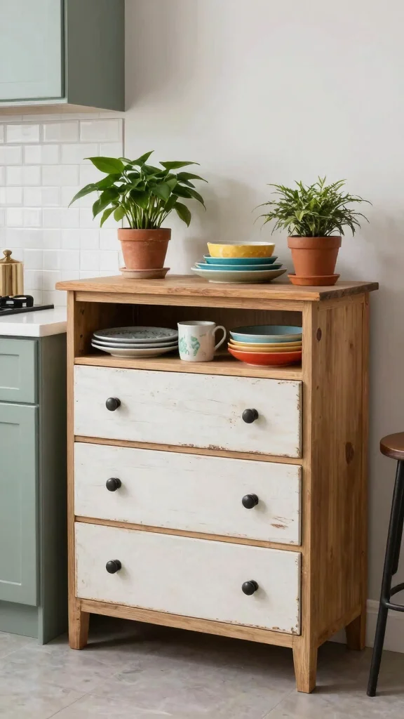 Painting or staining old pieces can help them match your decor, allowing you to repurpose them for various kitchen needs—whether it’s for storing dishes, utensils, or even as a coffee station. This sustainable strategy saves money and adds a personal touch to your kitchen.