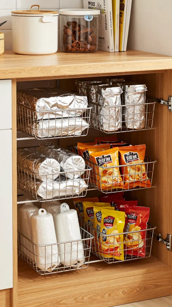 If you want to optimize vertical space in your kitchen, under-shelf baskets are an excellent choice. These baskets easily slip under existing shelves to provide additional storage without any major renovations. They’re particularly useful for keeping wraps, foil, or snacks organized and out of the way.