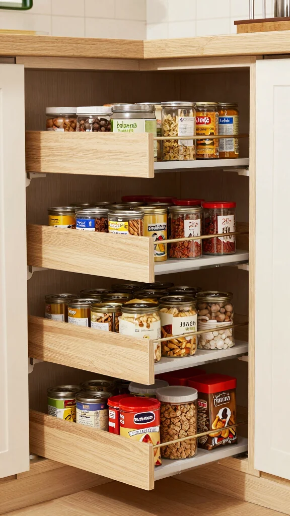 Transform your awkward corner cabinets into useful storage spaces with lazy Susans. These rotating trays allow you to fully utilize every inch of the corner, making it easy to access items in the back. They are ideal for storing pots, spices, or snacks often lost in deep cabinets.