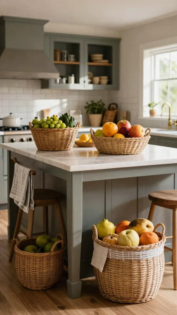Baskets can infuse both charm and functionality into your kitchen island. They serve as storage for everything from fruits to linens, and they come in various styles and materials.