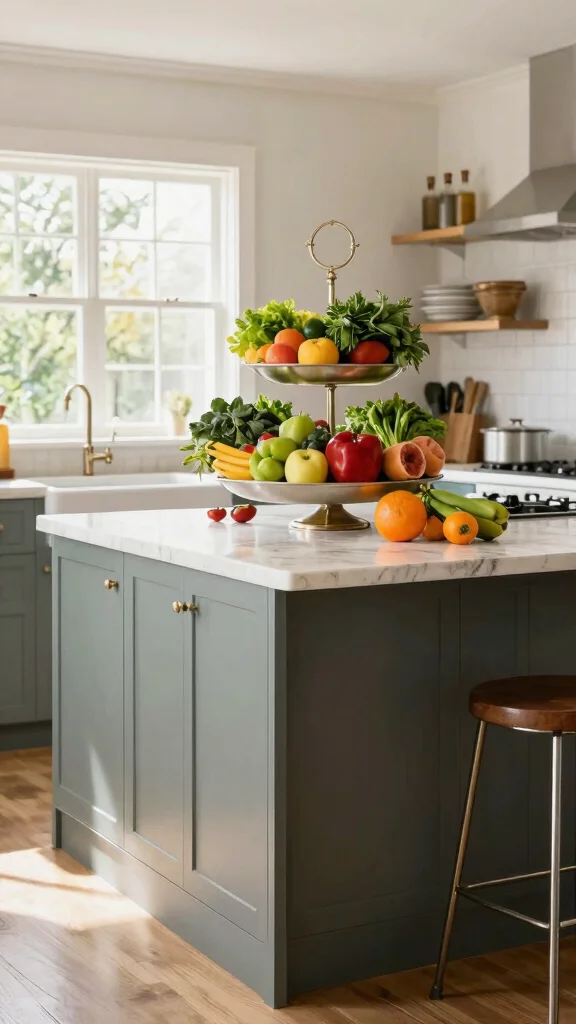 A tiered stand is an elegant way to store fresh produce while adding height to your kitchen island. These stands enhance both functionality and visual appeal, displaying fruits, herbs, or vegetables within easy reach.