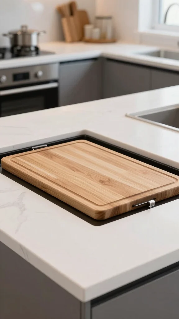 Select a wooden or plastic board that coordinates with your island and is easily removable for cleaning purposes. Pro Tip: Keep a knife block or magnetic strip nearby for quick access to your knives. This practical addition simplifies meal prep while maintaining an elegant kitchen design, especially in small spaces.